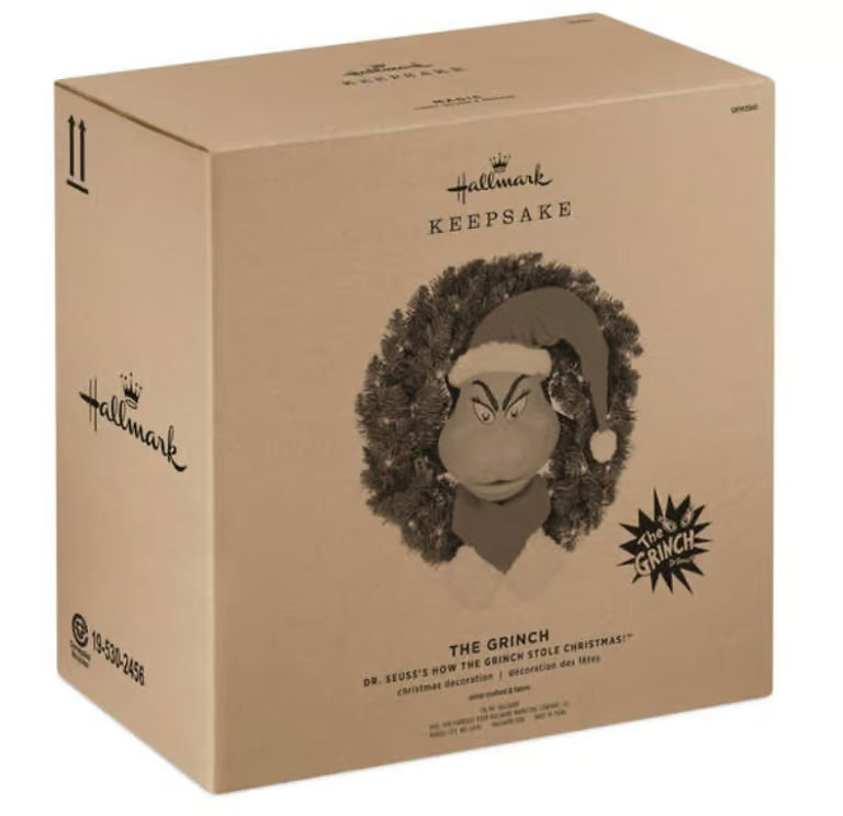 Increase your home's holiday spirit by three sizes with The Grinch Hallmark Keepsake Christmas wreath. Wearing a Santa hat and scarf, the Grinch moves as he says phrases from "How the Grinch Stole Christmas!" Power adapter included.